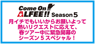 Come on! ALFEE!! Season5 「月イチでもいいからお願いよって熱いリクエストに応えて、春ツアー中に緊急開幕のシーズン5スペシャル!」配信決定!
